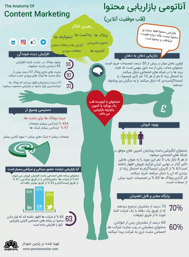 در اینفوگرافیک بازاریابی محتوا موارد استفاده از این تکنیک بازاریابی تصویرسازی شده است.